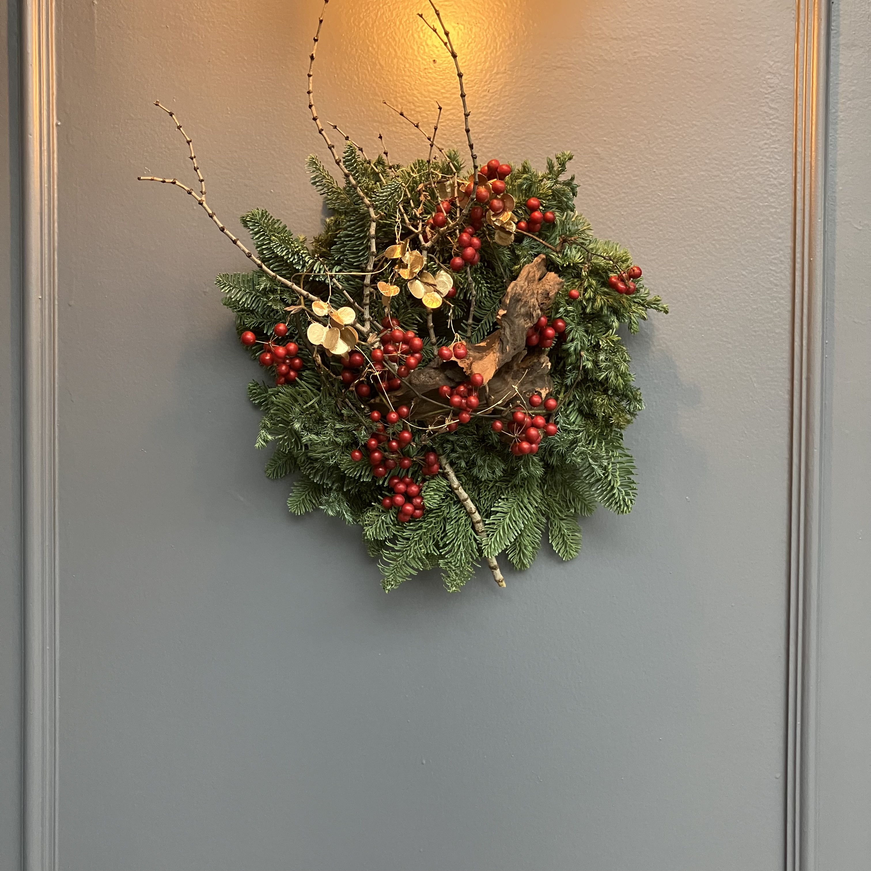 あと、今年も神戸のpitouさんにクリスマスリースお願いして飾っています。華やかになりました。