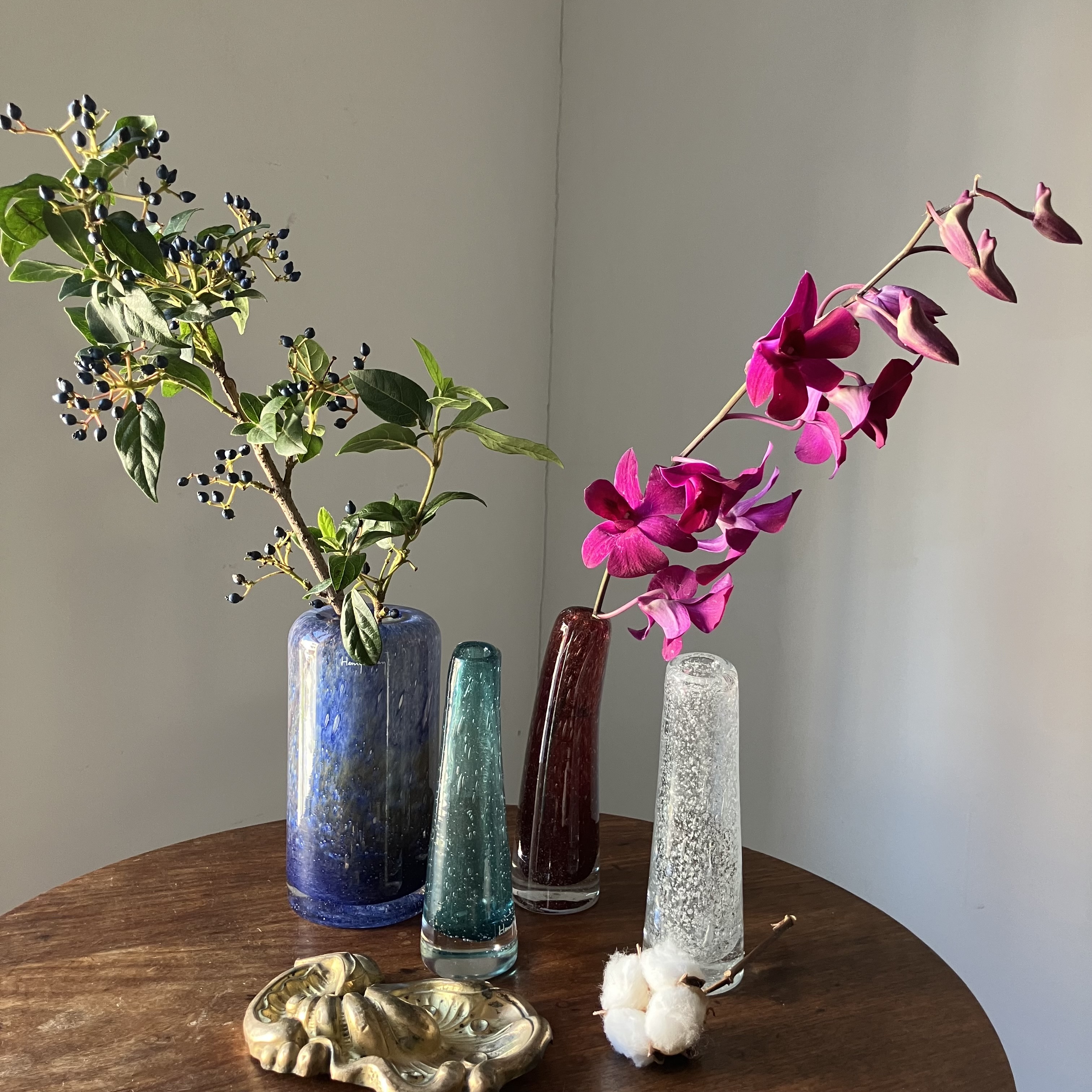 ひとつひとつ手作りで、リサイクルガラスを使って作られる表情と個性がある、フラワーベースです。