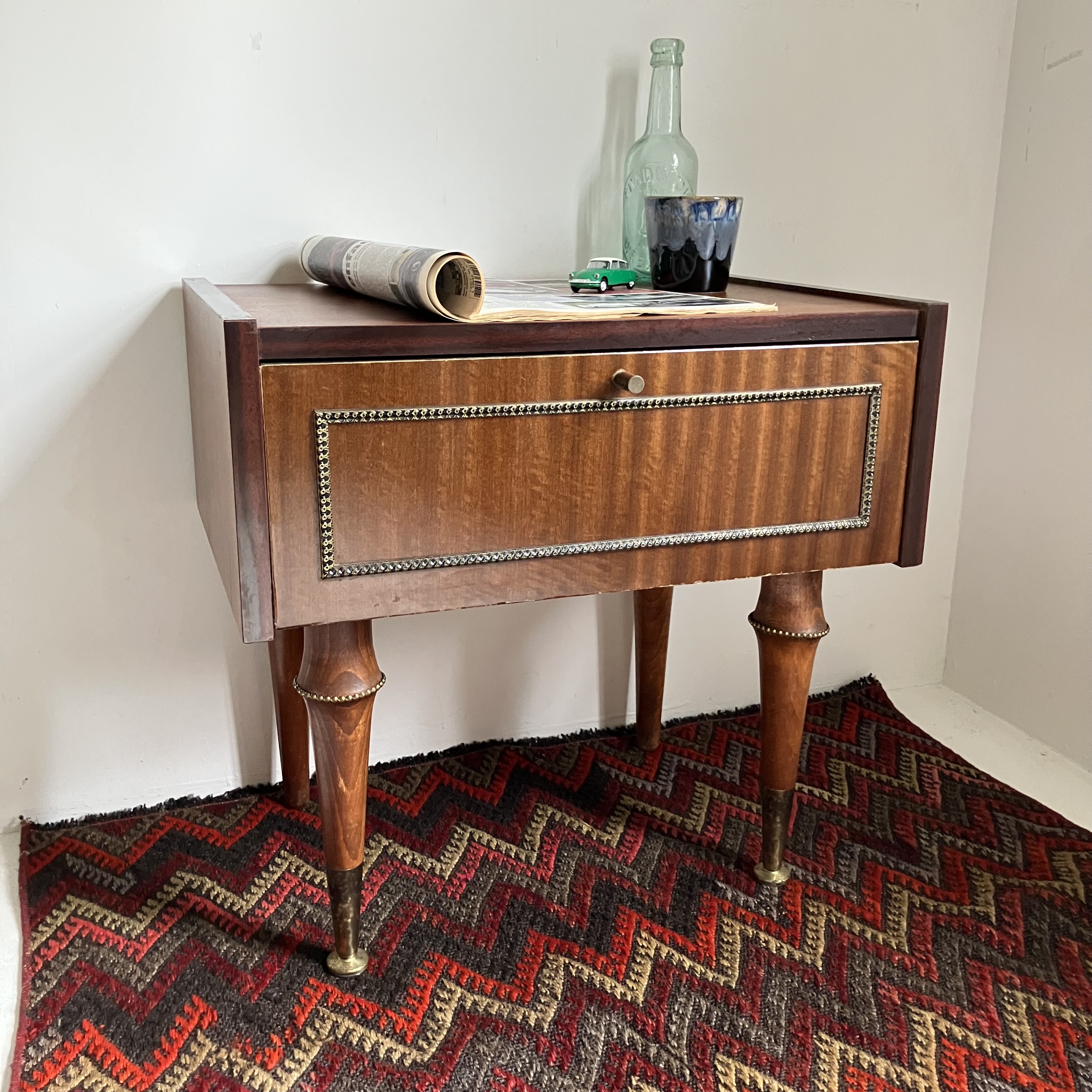 イギリスのモダンヴィンテージベッドサイドキャビネット。ちょっと癖のあるデザインと小振りなサイズ感でよい感じです。